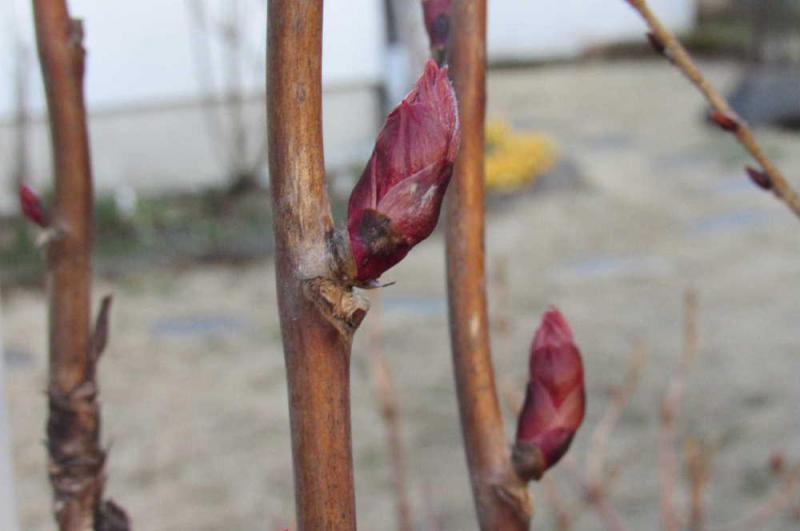 ●例年なら暖かくなる時期ですが今年はまた寒い日が続いてます このブログで高畠町の冬咲きのボタン祭りで咲いているボタンを紹介しましたが我が家のボタンは固く閉じて咲くまでにはまだまだ時間がかかりそうでようやくこんな芽をだしています