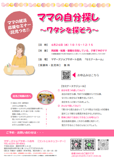 ☆マザーズジョブサポート庄内主催☆『ママの自分探し〜ワタシを探そう〜』のお知らせです。 自分自身のことを理解することからお仕事探しはスタートします。得意なこと、苦手なこと、長所と短所など、自分の棚卸しをして、「ワタシをアピールできること」を見つけましょう 【日 時】6月26日(水)10時15分〜12時15分 【対 象】再就職・転職・復職を目指している子育て中のママ※就職活動前で何かを始めたい方でもOK【会 場】マザーズジョブサポート庄内 セミナールーム【料 金】受講料 及び 託児料 無料【託 児】※事前登録・予約が必要です。ご利用希望の方はお問合せください。保育ルーム開室日【水・木・金】の10:00〜16:00に登録が必要となります。 ※併設の保育ルームで、保育スタッフが お子さんをお預かりします。 ママは安心して受講いただけます。 【駐車場について】お車でお越しの際は、中町庁舎脇にある〈セントラルホテル契約駐車場〉をご利用ください。(ジョブプラザさかたと表示してあります。)※契約駐車場が満車の場合は、酒田市中央地下駐車場をご利用ください。無料駐車券(最大2時間)を発行いたします。 どうぞ、お気軽にお問い合わせくださいね。 ◇お申込み・お問い合わせ◇マザーズジョブサポート庄内TEL:0234-28-8061メールでのお申込みはコチラ