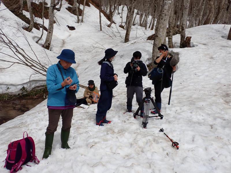 月山山麓地蔵沼周辺散策スケッチ。20人近い会員(新会員含む)で盛会。今年の積雪今までに無い減少?の中ここは月山,湯殿山下ろしで3mに吹きたまった積雪を見た。