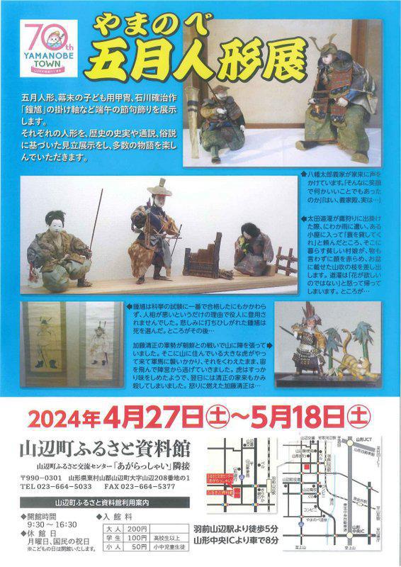 ふるさと資料館では、4月27日(土)〜5月18日(日)まで「やまのべ五月人形展」を開催します。五月人形や、幕末の子ども用甲冑、掛け軸など端午の節句飾りを展示します。ぜひ、ご覧ください。 『やまのべ五月人形物語』日時:令和6年4月27日(土)〜5月18日(土) ※月曜日、祝日は休館(こどもの日は開館いたします)時間:9:30〜16:30場所:ふるさと資料館入館料:大人200円 高校生・大学生100円 小中学生50円(未就学児は無料)お問い合わせ先:ふるさと資料館 TEL023−664−5033