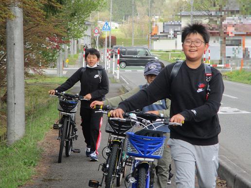 4〜6年生は、全員自転車を引いて登校。教職員も、要所要所に立って見守ります。 菜の花が咲く道路を、ルールを守って走ります。側溝が近かったり、歩道が凸凹しているところがあったり、風が強くてなかなか前に進めなかったり、ハードルが高い走行でしたが、アンテナをいろんなところに張って走行しました。 5年生は、2回目なので上手にできています。 交差点まで来ました。しっかり教えていただいています。「右よし、左よし、前よし、後ろよし!」で、Go!です。交差点を三回わたって安心した後、自転車に乗る時も「前と後ろを確認!」と駐在さんから大きい声で言っていただきました。 「命は一つしかありません。心臓が止まったらもう動きません!命を大事にしてください!」何度も言っていただきました。 「慣れ」たときが怖いですね。ぜひ、保護者の皆様にも、歩いたり、自転車に乗ったりしているときは、自分の身を守るものが何もないので、危険と隣り合わせだということを確認していただければと思います。