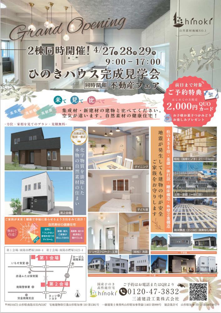 陽春の候 皆様におかれましては、益々ご清祥の事とお喜び申し上げます。さて、この度、南陽市椚塚に完成しましたモデルハウスの完成見学会を2棟同時開催いたします。『本物の自然素材の住まい』、柱の太さ4倍、基礎一体打設、剛床構造、外壁2重構造の高耐震、高断熱、高気密に優れた安心・安全・快適な住宅です。ぜひ、この機会に当社の健康住宅をご体感下さい。 ●日 時:4月27日(土), 28日(日), 29日(月) 9:00〜17:00 ※予約制となりますので、予めご連絡お願いいたします。 前日までの予約特典 2,000円分のQUOカード ( はじめての方限定 ) ●第一会場:南陽市椚塚1888−4 第二会場:南陽市椚塚1623−4 ●来場者得点:お子様プレゼント(お菓子のつかみ取り) お楽しみプレゼント ●ご連絡先 :0120−47−3832 ※ 当日は不動産フェアも同時開催いたします。 三浦建設工業スタッフ一同、皆様のお越しを心よりお待ちしております。