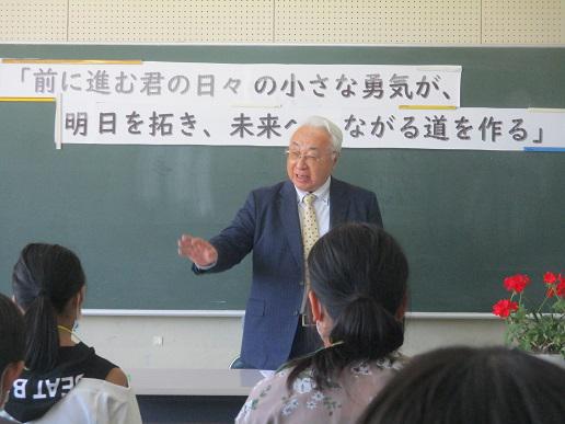 5月2日、5・6年生を対象に、日本進路指導推進協議会 会長の山口和士先生より、講演をいただきました。実は、蚕桑小学校に来ていただくのは、3回目。先生からのお話をお聴きしたのは、小学校5年生か中学校2年生まで、実に4学年にもわたります。 校長からは、人生は、「出会い」で大きく変わる。自分の命の砂時計を虹色に染めていくのは自分自身。この時間を大切にしようという話をしました。 先生からは、・ 戦争、災害など、世の中で多くのことが起きている。今ここに、健康で生きているの は奇跡。私たちは、生かされている。・ あいさつは、大きい声で、相手の目を見て堂々と。・ 基礎学力(日々の勉強)と思考力(考える力)をつけよう。・ 忍耐直と精神力、コミュニケーション力を日々の活動で身につけよう。ということや、自分の夢を果たすための10か条も教えていただきました。自分の夢を努力いて努力して果たしたパティシエの方からの、贈り物もいただきました。 根底には、「生きる意味とは」「自分の命を、人の命を大事に」…ということが流れていたと思います。 6年生は、2回もお話をお聴きして、どんなことを感じたのでしょう。先生からは、去年と比べてぐっと大人になったと言っていただきました。 「生かされた意味」を考えながら、まず自分のやれることに一生懸命取り組みたいと思います。山口先生、本当にありがとうございました。