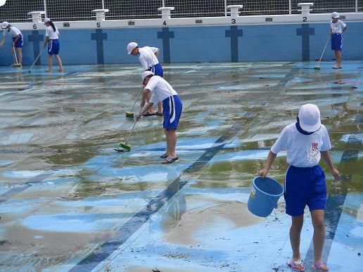 陸組、プールの中組に分かれて、プール掃除が始まりました。きれいになる様子をご覧ください。 階段組! そんなこともあるさ! 実はびしょぬれ! 余裕だなあ! 黙々と、水かけ組! もう少し! 最後の仕上げ! きれいになった、ありがとう!