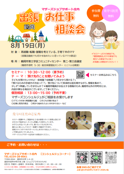マザーズジョブサポート庄内おしごと相談会 in 鶴岡を開催します。 【開催日】8月19日(月)【開催場所】鶴岡市第三学区コミュニティセンター 第二・第三和室【内容】◎10:30〜12:00 セミナー 「預け先のことを聞いてみよう」 ※お申し込みが必要です  「子どもを預けたいけれど保育園?幼稚園?」 「何歳から預ける?」 「預けるための手続きの方法って?」 鶴岡市職員を講師に招きし、預け先について 具体的な話をお聞きします。 情報収集をしながら少しずつ準備して いきましょう。  ◎13:00〜15:00 個別相談会 ※どなたでもご利用いただけます、  お申込みは不要です。  ・おしごとに関するお悩み  ・子育てに関すること  ・仕事と家事、子育てとの両立        など、お気軽にご相談ください。  ♪お子さんと一緒に、お気軽にお越しください♪お子さんと同じお部屋でセミナーを受講し、相談することができます。保育スタッフが、ママをサポートいたします。 どうぞ、お気軽にお問い合わせくださいね。 ◇お申込み・お問い合わせ◇マザーズジョブサポート庄内TEL:0234-28-8061メールでのお申込みはコチラ