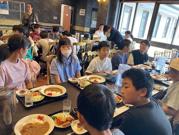 6月13日(木)12:2011時30分、松島観光物産館で買い物をした後、お待ちかねの昼食です。午後に行うかご網漁体験に向けてエネルギーチャージ!みんな元気に次の目的地(月浜海岸)に移動中です。