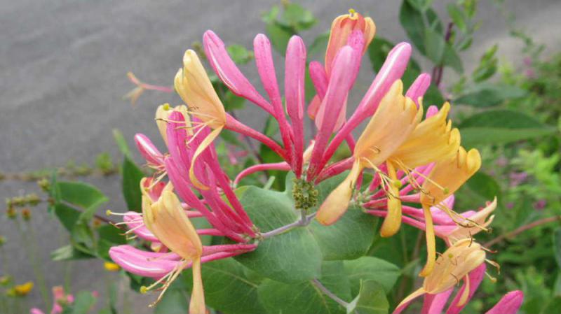 ●6月6日にブログで白い「スイカズラ」を紹介しました今日はオレンジ色のスイカズラ(ハニーサックル)を紹介します 花の形が独特で上下に大きく分かれた花びらの真ん中から雄しべと雌しべが飛び出すようについています 元々は日本の花だったそうですがヨーロッパで改良されて白だけでなくいろいろ色の花ができたということです