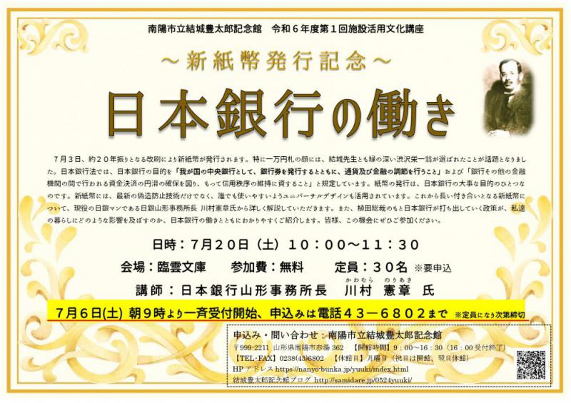 きたる7月3日、約20年ぶりとなる改刷により新紙幣が発行されます。これを記念し、日本銀行山形事務所長の川村憲章氏を講師に迎え講座を開催いたします。 新紙幣に搭載された新たな技術や、紙幣を発行する日本銀行の働きを、詳しく解説していただきます。大人の方からお子様まで楽しんでいただける内容であるほか、ご参加いただいたお子様には特別に“自由研究応援セット”をプレゼントいたします。この機会にぜひご参加ください。定員は30名、申込受付は7月6日(土)朝9時から電話43―6802で一斉開始いたします。※9時〜16時(月曜休館ただし月曜祝日の場合は翌日休館)