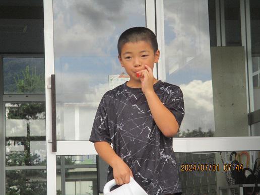 「あま〜い!」サルビアの蜜です。 繭の乾燥作業中、重さを計ってくださっています。今日で合格です! なんと、蚕の蛹です。乾燥しないものを取っておいてくださったのです。この蛹、みょこみょこ動きます! 花壇の草取りをしていると、お手伝いさんが来てくれました。「この中に、食べられるものがあります。な〜んだ?」「わかる、ひょうだよ。」「うちではお父さんが食べるけれど、おばあちゃんは食べない。」「うちのママは、知らない。おじいちゃんはわかる。」いろいろ聞こえてきました。 朝1番に水かけ! 4年生は、みんなで草取り。 「学校にもミントがあるよ!」「ほんとだいい匂い!」「なんだか、春の青春のにおいがする!」 「七夕通り」が出現! 養護の先生の作品。 ベニバナの先生が、学校に届けてくださいました! 朝の登校時に見つけました! メダカが増えた5年生の水槽 花壇に落ちている花を拾って、お皿の池に浮かべました!教室に飾ります!(^^)!「心の潤いシャワー」でした。
