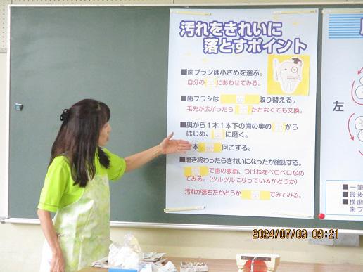 全校生対象のブラッシング指導がありました。町から、5名の方が来校し、こぐわっ子たちに歯磨きのご指導をいただきました。「歯ブラシは、自分の手のおや指の幅だよ!」ドキッ・・・ 「このお約束でね!」1か月に1回歯ブラシを取り換えてるかというと・・・ドキッ!でした。 一人ひとり歯磨きがきちんとできているか、「染出し」をしていただいています。 「さあ、お口の中は、どうですか?磨き残しが、赤くなっているところですよ。」「力を入れずに、1本の歯を20回から30回磨きます。」「前の歯は縦に磨きますよ。」 次の歯が待っているので、乳歯が虫歯になると、永久歯まで虫歯になってしまいます。「6年生まで、おうちの方に仕上げ磨きをしてもらうのですよ!」「 おうちの人に、仕上げ磨きをお願いしている人? 」 昨日の夜、こぐわっ子たちはいつもより丁寧に磨いたのでは?一生自分の歯で食べられるよう、みんなでがんばろう!