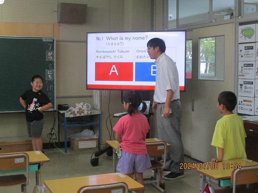 小学生になって、初めての英語の授業。保育園でも英語に触れているので、とてもスムーズ。 今年は、K教諭がどの学年にも主担当として英語を教えます。授業では先生との初めての出会いなので、クイズ形式で自己紹介しています。ALTの英語の指示で動いています。 自己紹介の仕方をみて・・・ 先生とやってみました。 すぐに友達と英語で自己紹介をしあうことができました。 1年生が大きくなるころは、もっともっと英語を使う場面が増えてくるし、もはやツールとして英語を使いこなさないと大変になる世の中になるかもしれません。何よりも、世界中の方々とコミュニケーションをとることはとても楽しいのです。世界に羽ばたく人になれ!