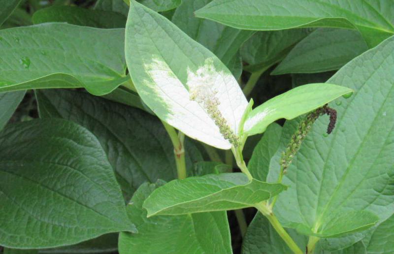 ●緑の葉に白いペンキを塗ったような「ハンゲショウ」の草花を見つけました 葉の半分ほどが白くなるので「半化粧」とか「半夏生」とか あるいは「片白草(かたしろぐさ)」と呼ばれているそうです 花が咲き終わって夏真っ盛りになると白い部分は色落ちして緑に戻るんだそうです 虫媒花ということで虫を誘う必要があるので白く目立つように進化しのではとの解説もありました でも不思議な草花ですね