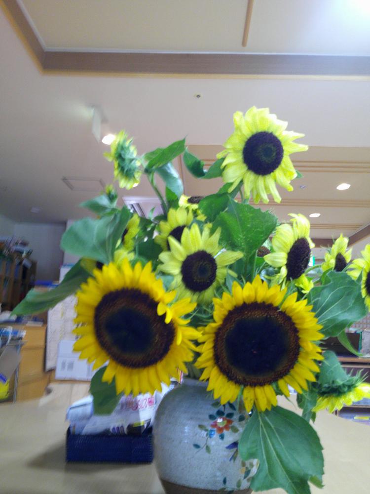 先日、利用者様がひまわりを持ってきてくださいました。大小様々あり、職員が花瓶に生けると…。あの名画『ゴッホのひまわり』を表現したような素敵なものが出来ました。毎日、蒸し暑い日が続いています。熱中症等増えているようなので、エアコンを上手に活用しお過ごしくださいね。