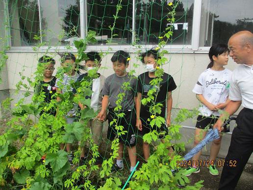 「せんせ〜、ゴーヤがなりました〜!」「とっていいよ!」「やった〜!」「じゃんけんで勝った人、もらっていったら?」きっと、4年生の誰かさんの夕食で、昨日はゴーヤ料理だったかな? 朝の2年生の教室。みんな、勉強中。 「ダイヤモンド」と「炭」の話を思い出しました。どちらも元素記号が「C」の炭素。高温と高圧でできたものがダイヤモンド、低温と低圧でできたのが炭。例えですが、「高温と高圧」を「みんなの努力」とすれば、努力でダイヤモンドになるという話です。2年生、ピカピカに光っていけ〜! トントン。ノックの音。なんとAさんが作文を書いたのでもらって下さいと、校長室に来ました。とてもうれしくて、内容を聞いて記念撮影。 時間差で次々に訪問客が・・。1学期、みんなの心に残ったこと、しっかり受けとめました。ありがとう! 1年生が6年生の教室で何やら話しています。 なんと、誰も知らないうちに6年の担任に1年生が訪れ、今1年生がやっている「くり上がりもくり下がりもない50問計算」を、6年生がどのくらいの時間で解けるか試してくれるように頼みに行ったそうです。いわば、1年生から6年生への挑戦状。 1年生は、2分以上かかる、では6年生は?1分かからずにほとんどの人が解いたということでした。さらにその結果を聴き、6年教室に「私たちは負けません!」と言いに行ったとか。なんとすばらしい! ちょっとうれしい話のおすそわけでした。