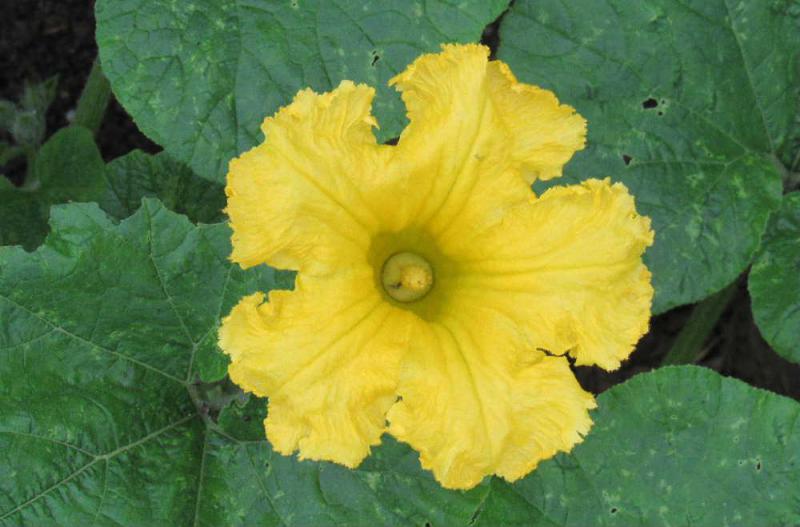 ●秋の野菜のカボチャの花がラッパのような形をして鮮やかに咲いています よく見ると花に下に小さな実のようなものが付いている花と付いていない花があることがわかりました 小さな実がついているのが雌花でついていないのが雄花です 秋の味覚の代表のような野菜です