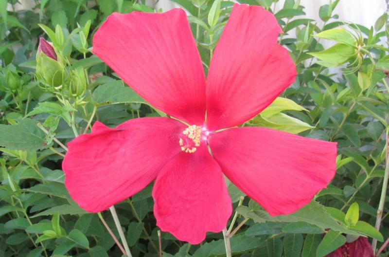 ●フヨウに似ているが花びらが離れて5枚咲いていました 葉がモミジに似ているところから「モミジアオイ(紅葉葵)」という名前がついたとか 白い花もあり紅色の花の色から付いた名前ではなさそうです 夏の終わりを告げる花でしょうか