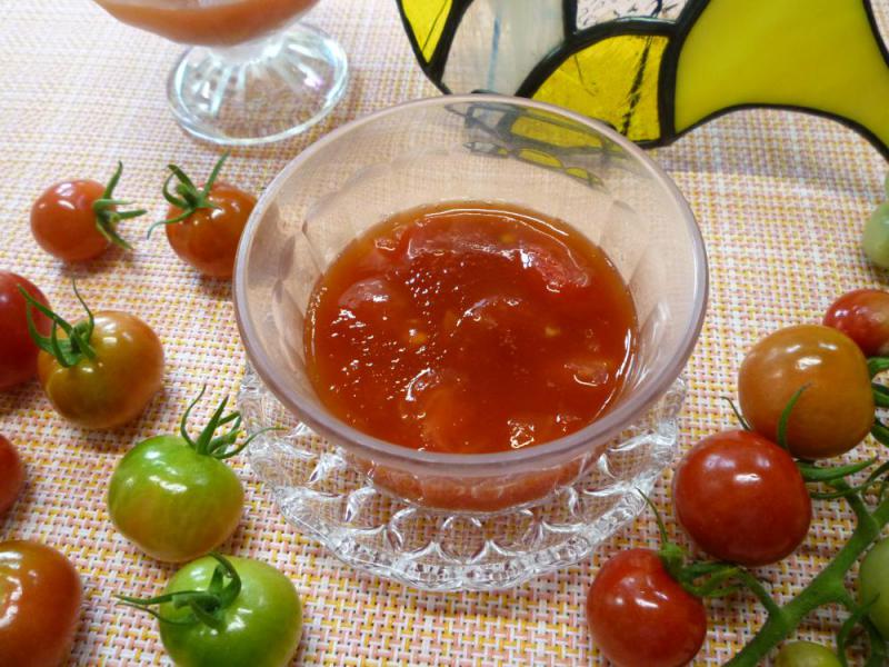 栄養課です。今回はおやつで提供した「トマトゼリー」を紹介します。白鷹産のトマトを湯むきして1cm角に切り、トマトジュース、上白糖、はちみつ、隠し味にレモン汁を入れて作りました。白鷹産のトマトは皮が柔らかく、デザート感覚で食べられる甘味があるトマトが多いので、皆さんも是非食べて下さいね。