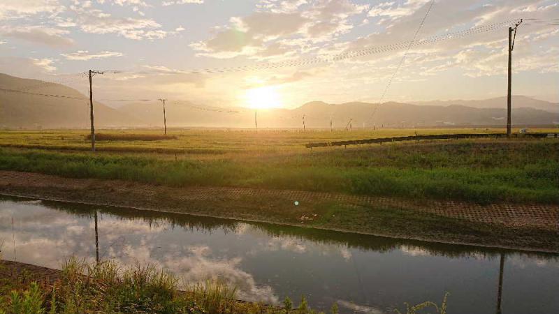 ●朝日に照らされて輝く稲穂 川面に映る青い空と白い雲 まさに絶景の初秋の朝日です 朝晩はめっきり涼しくなりしのぎやすい季節となり朝の散歩も気持ちの良い生活の一部となりました 今朝も青空が広がりいよいよ稲刈りも始まるのでしょうか秋本番を迎えます