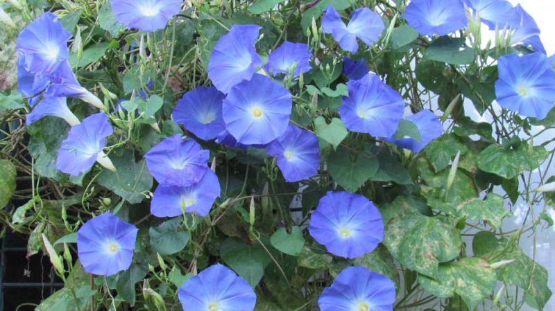 ●夏に枯れてしまってもう終わりだろうかと思っていいたセイヨウアサガオが一面に咲いています ざっと数えてみると多い日には100個以上さいています 今までにない咲き方におどろいていますが夏の暑さであまり見せてくれなかったお詫びに鮮やかに咲いているのでしょうか もうちょっと青紫色のセイヨウアサガオが楽しめそうです