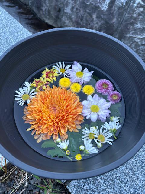 昨年は沿道に小菊の鉢ものでした。今年は、水に浮かべた菊が。 暗くなってからも、見に来ている方がいらっしゃいます。