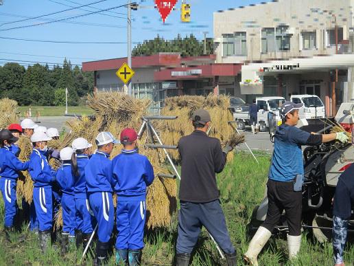 春の田植え、秋の稲刈り・・・そして脱穀。米という文字を分析すると、「八十八」になります。今は、機械化され、八十八回の手がかかる・・・こともなくなったそうです。稲穂を干して、乾いたものを脱穀。機械で、「もみ」と切られた「わら」になります。こぐわっ子たちは、稲穂をとって、青年部の方に手渡し作業です。 機会に乗せていただいたりもしました。 なんとも言えない、秋のにおいを感じながら、精を出して働きます。 機械の仕組みについて学んでいます。 怪獣の口の中のよう・・・。 稲を刈ったあとには、次の稲穂の赤ちゃんが・・・。この辺は雪が降って収穫はできませんが。 今年もいい勉強をさせていただきました。5年生は、これから稲作学習のまとめと収穫感謝祭に向けて準備します。