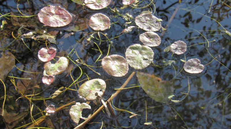 ●野草園の池に「アサザ」と表示されている水草が浮いていました 水底を横に根を張り広がるそうですが夏から秋にかけては黄色の花を咲かせるそうです 若葉は食用にされるということですがヨトウガやマダラミズメイガ の幼虫の好物で1〜2日で葉が穴だらけになるようですから食べるには勇気がいります 生育の盛んな時期は葉が濃緑色だそうですがなんとなく色もあせてしまっているようです 今年の最後の葉でしょうか