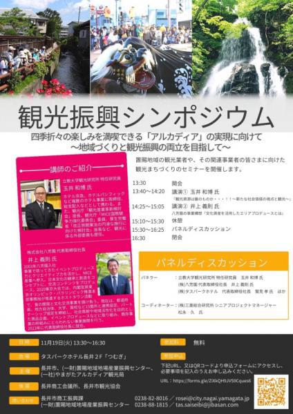 「 四季折々の楽しみを満喫できるアルカディアの実現に向けて〜地域づくりと観光振興の両立に向けて〜」 日時:令和6年11月19日(火)13時30分〜場所:タスパークホテル長井参加料:無料参加申込み:チラシのQRを読み込みフォームにて 講師:立教大学観光研究所特任研究員 玉井和博氏 株式会社八芳園代表取締役社長 井上義則氏 株式会社タスパークホテル長井代表取締役社長・やまがたアルカディア観光局専務理事 鷲見孝氏 ほか 問い合わせ先長井市商工振興課(0238-82-8016)(一財)置賜地域地場産業振興センター(0238-88-1815)