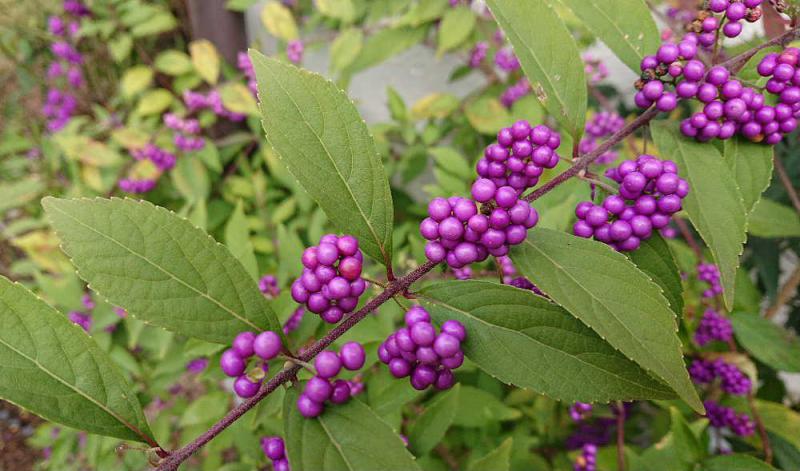 ●紫色に鮮やかに輝く「ムラサキシキブ」の実が庭のすみに実っています 数年前に耕作放棄地となっていた荒れ地に生えていた小さな苗の株を掘って来て庭に植えたものですがすごく大きくなりたくさんの枝を広げたくさんの実をつけています 日本原産で昔から山地の湿地や森林に自生しているんだそうです 我が家のこの花木も自生していたものでしょうか 秋が深まって赤や黄色、紫色の実がそちこちに実っています 秋ですねえ