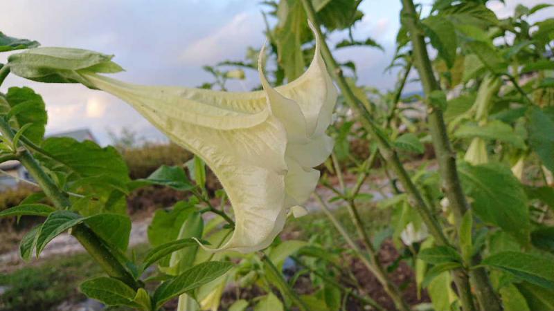 ●散歩道のそばの畑に「エンジェルトランペット」が葉の付け根から垂れ下がるように咲いていました 畑で農作業をしている持ち主に「まだ咲いていますね」と声をかけたら「霜が降りたら終わりです」と返ってきました 熱帯植物だそうですが寒さにも比較的強いのが特徴だそうです 白の他に黄色やピンクの花も咲いていました 色も様々あり比較的育てやすい植物だそうです 名前も絵画に描かれる天使がもつラッパに似ていることから付いたといわれています 今朝の寒さでもしかすると花は終わっているかも