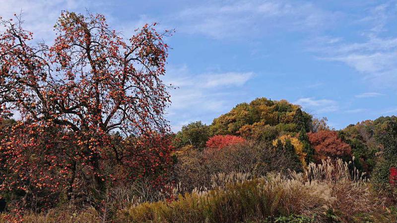 ●思わず車をとめて撮った一枚です 黄色や黄緑になった山の中腹に真っ赤に色づいた木 その前には白いススキの穂が風に揺れ 黄色の実をつけたカキの木が澄んだ青空を背にポツンと生えていました まさに秋の木々や草花の競演ですが今年の見納めでしょうか 秋本番ですがそろそろ雪の便りも聞こえてきました