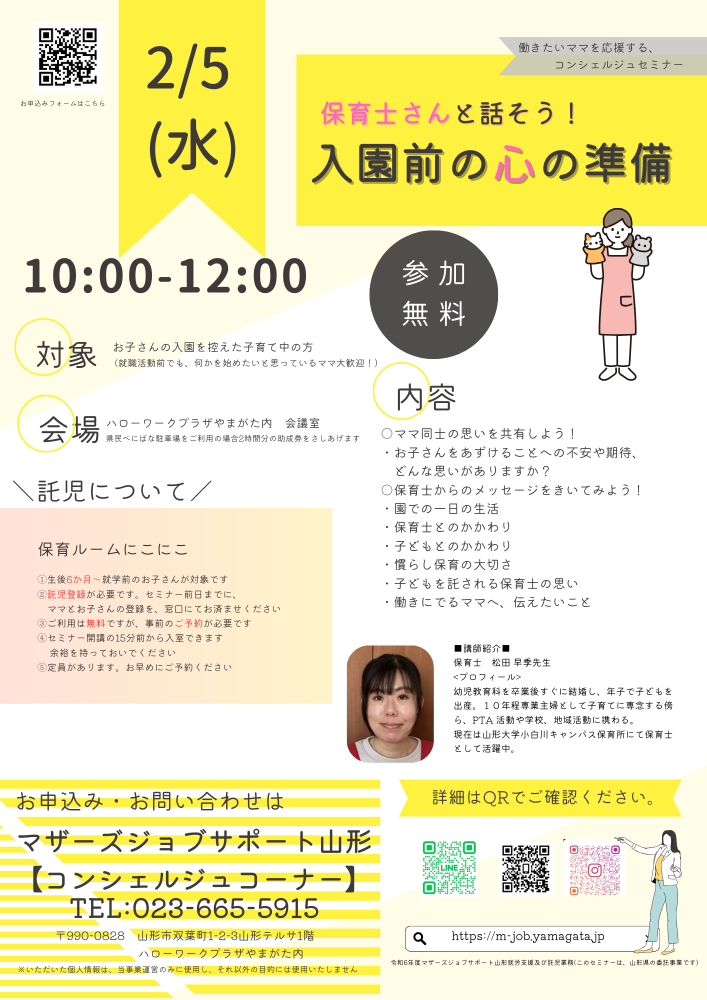 お子さんを預けて働きだすママへ  「保育士さんと話そう! 入園前の心の準備」を開催します! ―もうすぐ入園だけど、なんだか心配…。―子どもは、園でどんなふうに過ごすのかな?―今の私が準備すること、知っておくべきことって?そんな不安をおもちのママに、ぴったりのセミナーです♪ 就職を前に、園でのお子さんの生活を知り不安な気持ちを解消しませんか?現役の保育士が講師となって、ママの第一歩を お手伝いします☆☆--------------------------☆【日時】2月5日(水)10:00〜12:00【講師】保育士 松田早季 先生【会場】ハローワークプラザやまがた内会議室【託児定員】 4名【受講料・託児料】 無料☆--------------------------☆ ご興味のある方はぜひ、お問合せください♪ お問い合わせは…マザーズジョブサポート山形TEL:023-665-5915メールでのお申し込みはコチラLINEはトーク画面にて「お名前、お申込み講座、託児の有無、お電話番号」を送信してください返信をもって申込完了となります