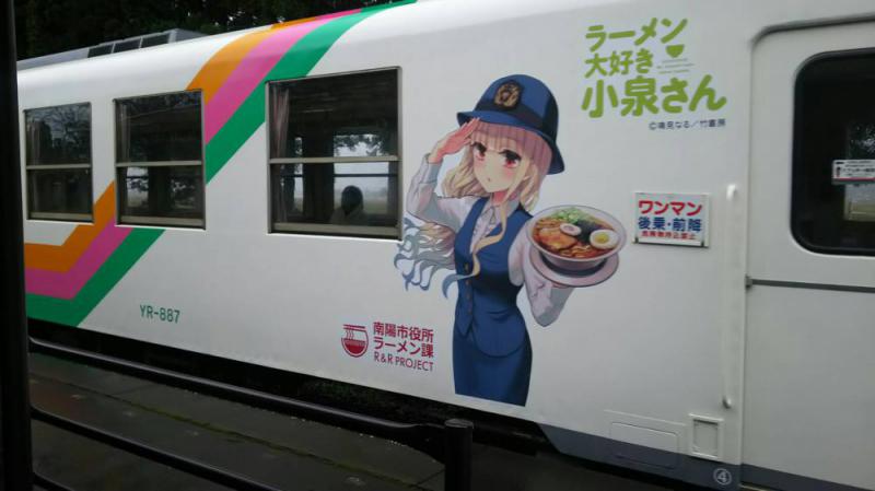 11月23日 ○フラワー長井線の駅タグ集めで来訪。時々雨降る中の羽前成田駅。虹もたくさん見られました。古き良き駅舎です。(山形出身大阪在住A.F) ○「ラーメン大好き小泉さん」の車両が来ました。うれしい! (佐藤)【おらだの会】「ラーメン県・そば王国やまがた」キャンペーンとして、「なんようしラーメンカードラリー」が展開中です。また1月18日(土)には、置賜のラーメン・そばを堪能できる「山形鉄道出前列車」が発車します。長井が生んだびっくり肉まん「馬肉ラーメン肉まん」のお土産付きです。ぜひご乗車ください。→ 《1月18日》「ラーメン県そば王国やまがた」出前列車について | 山形鉄道株式会社