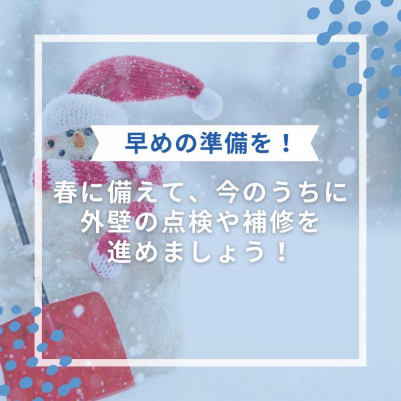 本格的な冬に向けて、だんだんと寒くなってきましたね。寒い冬が続くこの時期、外壁の塗装作業は一時的に難しくても、外壁の点検や補修作業は今のうちに進めておくことを強くおすすめします。 春が訪れ、暖かくなると多くのお宅で外壁塗装を行いたいと考えるようになり、塗装業も繁忙期に突入します。ですが、冬のうちに点検や補修をしっかり行っておけば、春の忙しい時期にスムーズに塗装作業に移行でき、他のお宅よりも優先的に施工ができます。 1. 今のうちに外壁の点検をしっかりと 外壁は、風雨や紫外線、雪などで年々劣化が進んでいきます。寒い季節だからこそ、積雪前に外壁のひび割れや劣化をチェックしておくことが大切です。ひび割れやシーリング部分の劣化をそのままにしておくと、春や夏の雨水が侵入し、さらにダメージが進行してしまいます。点検を行い、必要な補修を今のうちにしておくことで、外壁がしっかりと守られ春に向けて最適な状態を維持できます。 2. 補修作業で問題箇所を先取り 外壁に亀裂や劣化が見られる場合、その部分の補修を冬の間に行っておくと、春の塗装作業がスムーズに進みます。ひび割れを放置しておくと、そこから水分が侵入し、カビや腐食の原因になることもあります。冬のうちに補修をしておけば、春の塗装作業をすぐに行える状態に保てます。また、補修後の塗装がしっかりと定着するため、より長持ちする仕上がりになります。 3. 春に混みだす前に準備を整えよう 春になると、多くの住宅で外壁塗装やリフォームの需要が一気に高まります。そのため、春に入ってから急いでご依頼をいただくと、希望のタイミングで施工できない場合があります。しかし、今のうちに点検や補修を終わらせておくことで、春の繁忙期に優先的に施工させていただける可能性が高まります。お客様にとっても、準備を早めにしておくことで、忙しい季節に慌てることなく、予定通りに外壁塗装を進められます。 4. 冬の点検作業ならではのメリット 冬の間に行う外壁の点検や補修には、気温が安定していることや、湿気の影響を受けにくいというメリットもあります。この時期にしっかりと補修をしておけば、春になったときに最適な状態で塗装作業に入ることができ、施工がよりスムーズに進みます。 寒い冬の間に外壁の点検や補修を行うことで、春の塗装がより効果的に、そして確実に行えます。春の繁忙期に焦らず、スムーズに施工を進めるためにも、今のうちに準備を整えておきましょう。ぜひ、この機会に点検や補修を進めて、春に向けて外壁の健康を守りましょう!