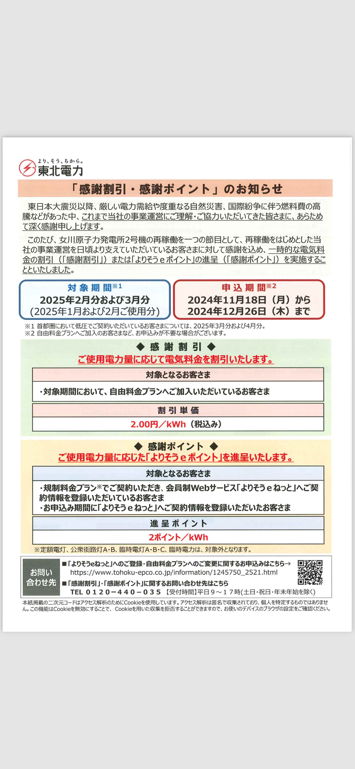 ●〜東北電力 感謝割引・感謝ポイントのお知らせ〜