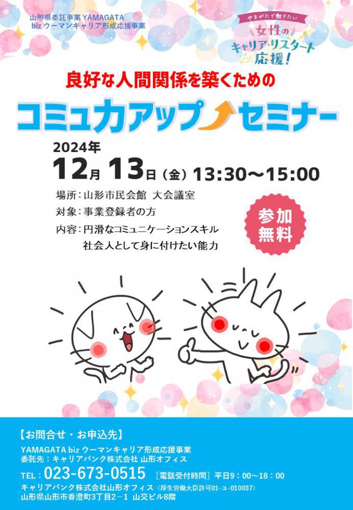 すっかり寒くなってお鍋が美味しい季節になりましたね。 みなさんの就職活動いかがでしょうか?もし一人で悩んでる人がいたら是非カウンセラーに相談してくださいね。 さて、YAMAGATA biz ウーマンキャリア形成事業では、 「コミュ力アップセミナー」を開催することになりました! 多くの企業が求める人材で、必要な能力はコミュニケーション能力とこたえています。 コミュニケーション能力アップのコツを身につけて、仕事上だけでなく、身近な人とも良好な人間関係を築いていきましょう。 興味がある方は是非ご参加ください。 参加資格は事業登録者のみ対象です。参加したい方は担当のカウンセラーにお申込ください! 【未登録の場合】登録説明会へご参加いただき、本事業の登録をお願いします。 【登録説明会にご参加いただくには】ホームページお申込フォーム もしくは、023-673-0515(キャリアバンク且R形オフィス)より、お申込みください。 本事業は山形県の委託事業のため費用は全て無料です。 さまざまな支援をご用意しておりますので、ご登録おまちしております。山形 就職 転職 女性活躍
