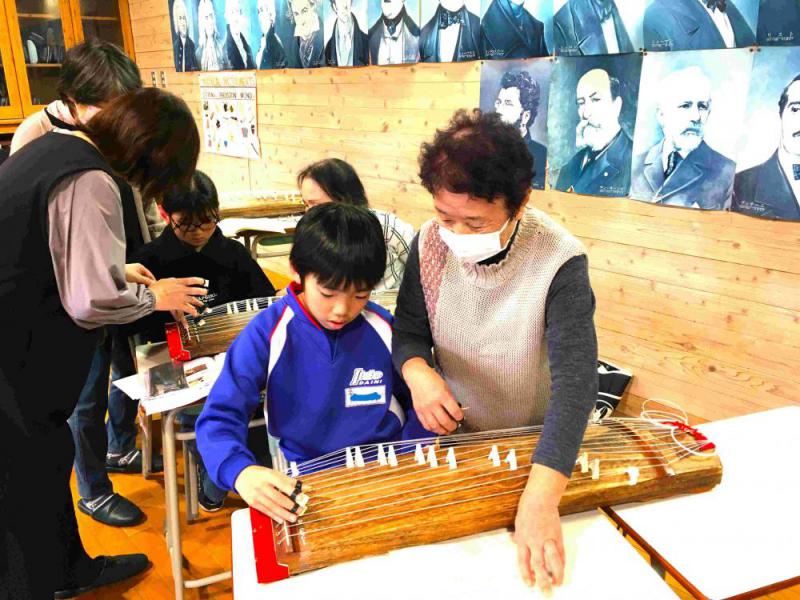 11月29日の音楽の時間に、地域の先生方が4・5年生に筝の演奏を教えてくださいました。今回は、9名の地域の先生が来校してくださり、とても手厚く指導していただくことができました。教えていただいた曲は、4年生は「さくらさくら」、5年生は「夕焼け小焼け」です。先生方の丁寧なご指導のおかげで、子供たちの腕もみるみる上達したようです。家庭科の裁縫もそうですが、地域の方々に支えられて学習できる環境、ほんとうにありがたいことです。