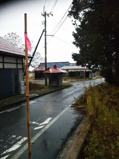 スノーポールの設置、降雪量の多い地区では、道路端にたまった雪で、どこまでが道路の端なのか判らなくなることがありので、毎年スノーポールがされます、積雪が多く地面が見えなくなっても、道路と道路の外を区別することができます。わが地区の道路は小さな能動みたいなところ、ここでは竹のポールでピンクのリボンが先っちょに着きます・・雪降る前に車が通る位置はみなポールが立つわけで・・その数たるや相当なもんですね・・反射板の付いた立派なものではないですが・・要所要所に立ててあります、我が家も玄関から市の道路まで立てます・・昨日朝からふもとで初雪となりました・・除雪機試運転しないとですね・