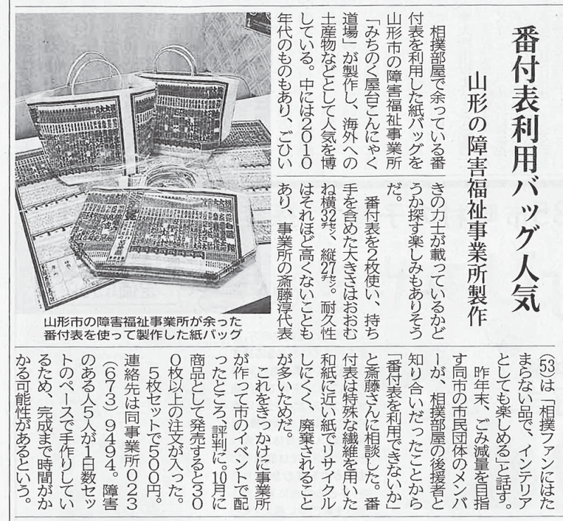 番付表利用バッグ人気山形の障害福祉事業所製作河北新報