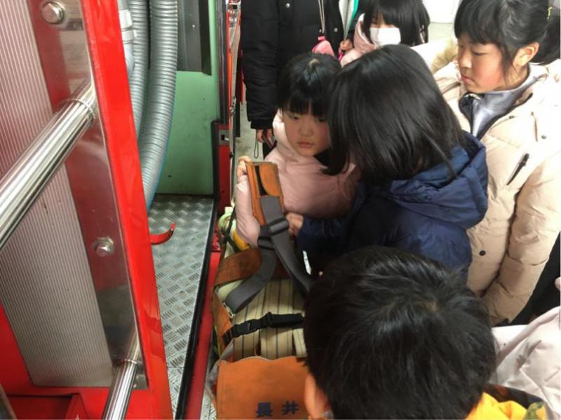 救急車や消防車、化学車を見せていただきました。消防ポンプの重さに、子供たちもびっくりしていました。日頃のトレーニングの大切さがわかったようです。