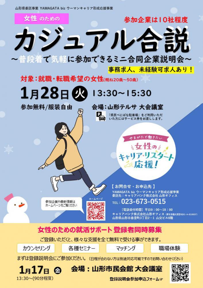お仕事をお探しの方、「自分に合った仕事がわからない」「未経験だと仕事内容くわしく知りたい」そんな就職活動に不安を抱えている方はいませんか?様々な業種、職種10社程度の企業が出展し、会社の事業内容やお仕事の内容などはもちろん、そこで働いている人の本音やリアルな生の声など、求人票にはない情報を知ることが出来ます!!当日は1社あたり15分程度で様々な企業の情報を聞けます!!面接ではありませんので、普段着でお気軽にご参加ください。 1月28日(火)13:30〜15:30会場:山形テルサ 大会議室対象:就職・転職希望の女性(概ね20歳〜50歳) 学生は対象外です。参加無料 服装自由※『県民べにばな駐車場』をご利用いただいた方にはサービス券をお渡しします。 参加企業は、こちら ↓↓↓https://yamagata-woman.biz/log/?l=546004