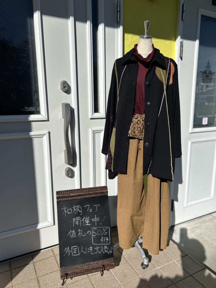 まずは写真をご覧ください(親指と人差し指で写真の上でつまんだ状態から広げると写真が拡大します)。ikoi(憩い)で扱っている「和柄」は、(ポリエステル100%)の素材のものがたくさんあります。 丈(たけ)も腰上までのものから足(太もも)のところまでいろいろありますし、袖(そで)も長めや七分など、生地の厚さもさまざまで、用途に合う商品が見つかりやすいくらいの商品数があります。とても暖かい商品(地厚)も揃っており、ポリエステル100%は、洗濯ネットに衣類を裏返して入れて、洗濯し(柔軟剤は入れても入れなくても可)、洗濯後、洗濯ネットを取り出し、ファスナーを開けて衣類を出して、形を整え、(衣類を裏返したまま)陰干ししますと、色落ちせず日焼けもしないで数年新品同様に保ったまま着れます。 愛着のある衣類を大切に着れるって、素晴らしいですよね! 3枚目、4枚目の写真のように、さまざまな和柄が半額(50%OFF)でただいま出しております。 今年の寒さや雪の状態がどのくらい続くか、正直読めないので、いつまでこのイベントを実施できるかわかりませんが、寒いうちは続けたいと思っております。 どうぞ、いろんな和柄を試着してみて、楽しんでみてください。