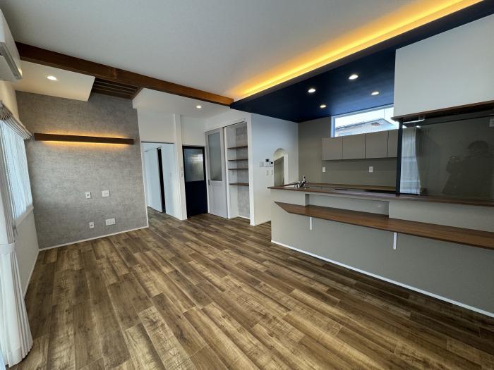 先日、12月引き渡しの方の完成立ち会いに行ってきました。内部のLDKはオシャレな空間に仕上がり、天井高も高いため光が奥まで通り開放感がありました。 色合いも現場で立ち会って決めていったので、バランスよくまとまったと思います。こちらはキッチン側から見た内観です。レンジフードの壁が耐熱ガラスになっているため開放感が出て、広く感じました。こちらは玄関廻りのデザインでRのカタチが緩やかに作られて柔らかい印象を持ちます。また右側は階段下食品庫で同じくRの下がり壁を設置しております。今後もお客様のリクエストに応えて『よいいえ』を建てて参りたいと思います。