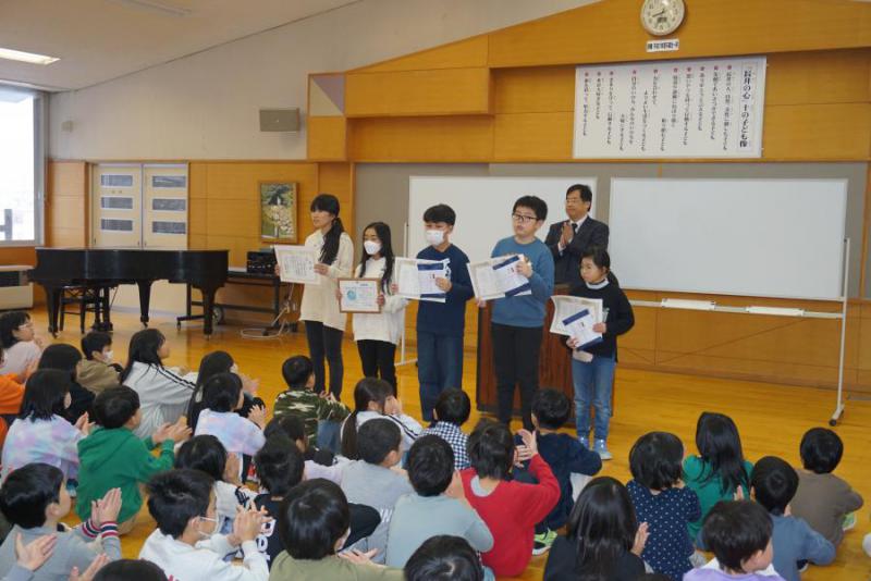 今日の全校朝会は、まず表彰から。防火ポスターコンクール、税に関する絵はがきコンクール、そして、「小さな親切」作文コンクールの3つについて、5人の表彰です。今回、受賞は叶わなかったかもしれませんが、コンクール等に応募した人は他にもいたことでしょう。その価値にかわりはありません。いろんな機会に挑戦していきたいものですね。続いては、冬休みのくらしについてのお話です。休みは13日間。「安全で楽しい」冬休みとなるように、@規則正しい生活、A安全な生活、B礼儀正しい生活、C冬にチャレンジ(読書、お手伝い、スキー)という項目で、大切なこと、頑張ることを確認しました。冬休みまで、あと1週間、まずは2学期をしっかりとしめくくりましょう。