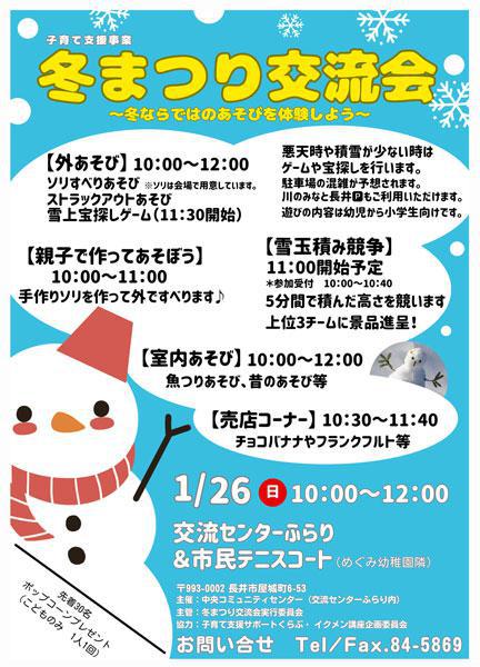 ※この事業は終了しました。ご参加・ご協力ありがとうございました。 冬ならではの遊びを体験する冬まつり交流会を今年も開催します。 交流センターふらり の長井市テニスコートをメイン会場に行います。 小学校低学年ぐらいまでのお子さんが楽しめる内容です。 当日は雪あそび のできる格好でお越しください。 雪が積もらない場合もゲームなどを楽しむ予定です。ぜひご参加ください。 い つ:令和7年1月26日(日) 午前10時〜12時 どこで:交流センターふらり(長井市屋城町6-53)※長井めぐみ幼稚園の隣です。あそびのメニュー(予定):【外あそび】ソリすべり、的あてあそび 他【親子で作ってあそぼう】ソリを手作りします【室内あそび】魚つりあそび 他【 雪玉積み競争 】11時開始予定【 雪上宝探し 】11時30分開始予定【売店コーナー】※積雪が少ない場合は別のメニューに変更します。※市内の保育園、幼稚園、小学校にはチラシを配布しています。※諸般の事情により中止になる場合があります。ご来場の前に当ホームページでご確認ください。 詳しくはこちらから(チラシ・PDF) 主催:長井市中央コミュニティセンター(電話とFAX 0238-84-5869)主管:冬まつり交流会実行委員会協力:子育て支援サポートくらぶ、イクメン講座企画委員会 Instagramはこちら
