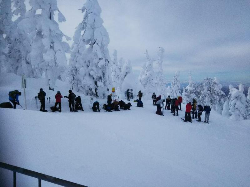 1月19日(日)西吾妻山にしてみれば、この時期だと月に1、2しかない晴れの日、天元台高原スキー場湯元駅920mからロープウエイで1350m高原駅に、そしてリフト三本を乗り継ぎ1820mへと行く、そこはもう別世界、だいたい朝9時台で−10℃からー15℃というところ、ここ数年、天気がよい日曜日になると西吾妻山への登山客が百数十名とやってくる、栂もりゲレンデの大きな樹氷が見えて、そのあとはアオモリトドマツの灌木林が、もりもりとした真っ白な塊になっている。いろんな形をしたモンスターたちに出会える、西吾妻は風が強く雪が歯ブラシのようにつくので歯ブラシ樹氷と呼んでいる、福島のグランデコ側からか天元台側から登れる、写真は天元台の第三リフト降り場(北望台:ほくぼうだい)から西吾妻の登山口2025年1月19日早朝9時ころ