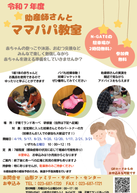 赤ちゃんの抱っこや沐浴、おむつ交換などみんなで楽しく勉強しながら赤ちゃんを迎える準備をしていきませんか?★N-GATEの駐車場が2時間無料♪★参加費無料場 所:子育てランドあ〜べ 研修室(住所は下記へ記載) 対 象:安定期に入った妊婦さんとそのパートナーの方 (妊婦さんお1人での参加も大歓迎です!) 開催日:4/19、5/17、8/23、9/20、12/20、1/17、2/21、3/21 いずれも土曜日 10:00〜12:15 定 員:7組程度(感染症等の状況に応じて増減の可能性あり) ※要申込 お申込みは1か月前からとなります ご案内:終了後にあ〜べの広場と託児の見学もあります♪ 持参物:特にありませんが、駐車券のみご持参ください ※感染症等の感染予防のため、検温や手指消毒を行います【お問合せ・お申込み】山形ファミリー・サポート・センターTEL:023-687-1720 FAX:023-687-1721受付時間:月曜日から土曜日の9:00〜17:00〒990-0042 山形市七日町1-1-1 N-GATE1階(子育てランドあ〜べ内)