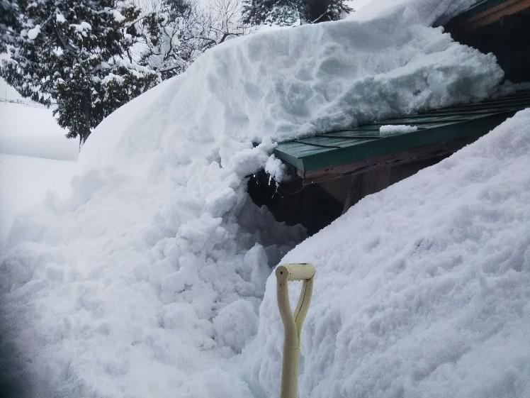 今年は大雪、ついに家の北側軒下まで雪がたまり、屋根の雪が降りれずに台所、風呂、トイレ、納戸が真っ暗になりました。屋根と軒下は同じとこまで、早くやんないとと思いつつ・・・ついついあとおくりに、とはいえ限界でスノーダンプで除雪しました・・何時間もかかりヘロヘロです・・もう雪を押すところがない状態に、2017年に移住してこんなに多いのは初めてです・・