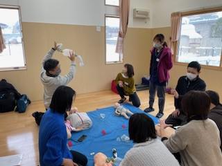 警報級の大寒波の中、ホワイトアウトを潜り抜け、いざ長井市へ!今日は置賜保健所と共催にて置賜地域の支援者の皆様を中心にお集まりいただき、研修会を開催しました。会場としてご協力いただきましたすみれ学園さんは今年度開所されたばかり。外は大雪でしたが開放感のあり明るい光が差し込むホールや各スペースといった恵まれた環境の中で参集することができました。イーランニングにて事前学習に取り組んでいただいたので、本日の流れを説明・質問を確認後、早速3つのブースに分かれて手技研修に入りました。心肺蘇生では体格差のあるモデル人形を5体設置しました。体格に合わせた力の入れ具合が理解しやすかったのではないでしょうか。「ぼーにょ、ぽーにょ、ぼーにょさかなのこ」のリズムは、そのフレーズから慌てている中でも思い出しやすいですね!「カテーテルが抜けてしまったら…」「気管カニューレの再挿入って」「吸引する際の注意点は」など各ブースごとに手技の再確認の機会となったようでした。(医療ソーシャルワーカー)