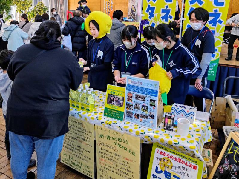 2月2(日)、山形県青年の家がコーディネートするボランティアサークル「nicoこえ」は、最上教育事務所主催の『令和6年度 最上地区ヤングボランティア交流会 & YYボランティアフェスティバル』の会場にて、通算30回目となるレモネードスタンドを開催しました。(第1回目、2022年10月9日ゆぴあマルシェから数えて) ボランティアサークル「nicoこえ」は2023年に『山形レモネードスタンドプロジェクト』を始動させ、多くの方々のご協力を得て小児がん支援活動を行ってきました。2023年分の結果報告は以下のURLをご覧ください↓http://seinen.jp/log/?l=536215 2024年は、これまでの山形レモネードスタンドプロジェクトを更に発展させた『山形 Make Lemonade プロジェクト(YMLP)』を立ち上げ、小児がん支援活動を行ってきました。県内では小児がん支援の輪がどんどん広がっており、多くの学校・ボランティアサークル・団体・企業、そして個人の皆様からレモネードスタンドを開催していただきました。「nicoこえ」としても14回のレモネードスタンドを行うことができました。(2024年1月20日アランマーレ戦から数えて)『山形 Make Lemonade プロジェクト(YMLP)』の詳細は以下をご覧ください↓http://seinen.jp/log/?l=534802 2025年になっては、「nicoこえ」として今回で2回目のレモネードスタンドとなります。(2025年1月19日アランマーレ戦から数えて) この日は、レモネードスタンドに加え、新聞フライングディスク作りのブースも担当し、YYボランティアフェスタに来場した幼児や小学生のみなさんに大いに楽しんでもらいました。 ちなみに今回は、「nicoこえ」メンバーだけでなく、ボランティアに興味を持つ最上地区の中学生5名も一緒になってレモスタとフライングディスクのブース運営を行ってくれました。 ご購入いただいたレモネードについては原価を差し引いた分を山形大学医学部を通して山形県の小児がん患者の支援にあてていきます。多くの方々からのご購入、ご声援に心より感謝申し上げます。 〜追記〜前回(第29回目)のレモネードスタンドは以下をご覧ください。http://seinen.jp/log/?l=546597 次回(第31回目)のレモネードスタンドは以下をご覧ください。https://seinen.jp/log/?l=547546