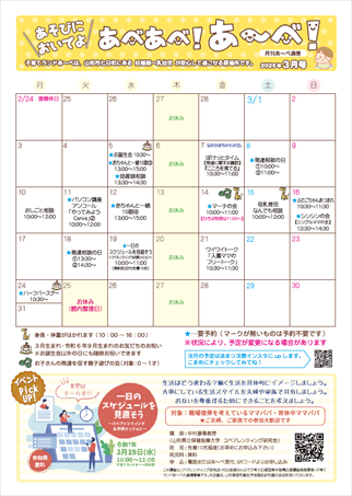 2025年2月15日発行あべあべ!あ〜べ!2025年3月号【PDF版】情報が一目で確認できちゃう『あ〜べカレンダー』は要チェック☆\子育てインフォ/「生活リズムを整える6つのポイント」新入園に向けて、やってみよう!※状況により、イベントに変更等があった場合は随時ホームページなどでお知らせいたします。【お問い合わせ】子育てランドあ〜べ023-615-1930